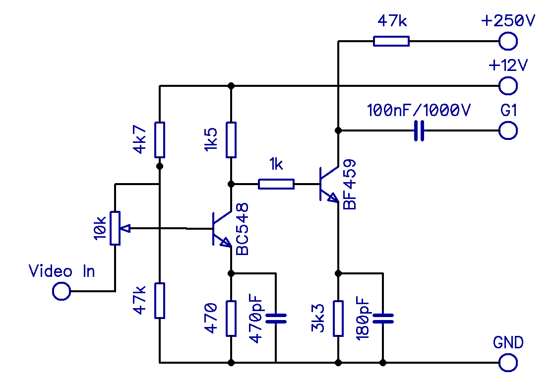 Dieser Verstärker ist zweistufig ausgelegt mit einem Kleinsignaltransistor als Eingangsverstärker und einem Leistungstransistor als Endverstärker. Beide Stufen sind als Emitterschaltung ausgelegt und über Kondensatoren im Emitterkreis auch HF-geeignet. Die Stufen sind direkt („galvanisch“) ohne Kondensator gekoppelt; erst der Ausgang der Endstufe wird über einen fetten 1µF-Kondensator mit 350V an die Helligkeitsregelung angeschlossen. Damit kann das Bild mit Wechselspannungen ausgetastet werden. Eine generelle Austastung wie bei der EE2007-Bildröhre ist damit aber nicht möglich.