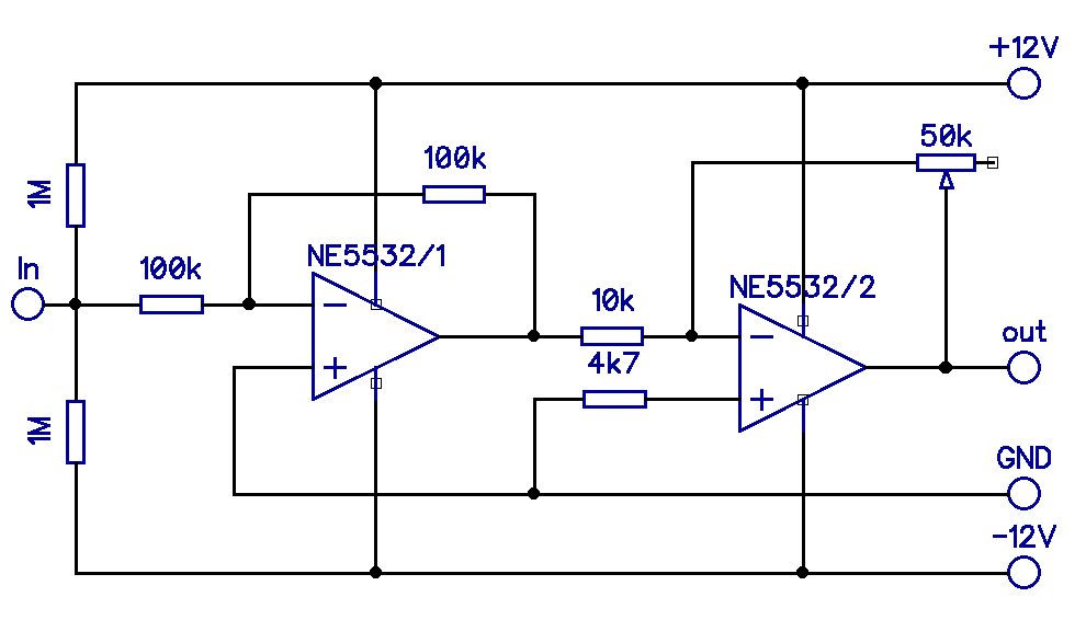 Diese Stufen werden durch je zwei OpAmps des Typs NE5532 gebildet. Diese Operationsverstärker sind rauscharm und benötigen eine symmetrische Betriebsspannung, die sie mit ±12V auch erhalten. Die Schaltungen selbst entsprechen dem Standard, zwei invertierende Verstärker, von denen der erste nur eine 1:1-Übersetzung liefert und der zweite über ein Potentiometer eine Regelung der Amplitude ermöglicht. Beide Verstärker sind identisch nach demselben Schaltbild aufgebaut. Der hochohmige Spannungsteiler am Eingang hält das Signal etwa auf Massepotenzial, damit der Bildpunkt auch ohne Quelle an derselben Stelle verbleibt.