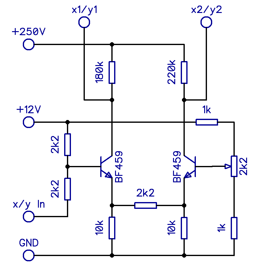 Die Endstufen bestehen aus symmetrisch aufgebauten Transistorstufen in Emitterschaltung. Beide sind über einen Widerstand emitterseitig gekoppelt und physisch zum Wärmeübergang miteinander verschraubt. Die Schaltung entspricht der Ittner-Vorlage, allerdings wurden die Widerstände geringer gewählt, um einen höheren Kollektorstrom zu ermöglichen. Dies war ein Ergebnis der zweiten Iterationsstufe. Beide Transistoren liegen am Kollektor ungefähr auf einem Potenzial von 170V; durch unterschiedliche Spannungen an der Basis des einen können sie eine Potenzialdifferenz von bis zu 30V aufweisen, was für die Auslenkung des Strahls vollkommen ausreichend ist und der Schaltung die nötige Empfindlichkeit auf Eingangsseite bei gleichzeitig hoher Leistung auf Ausgangseite gibt.